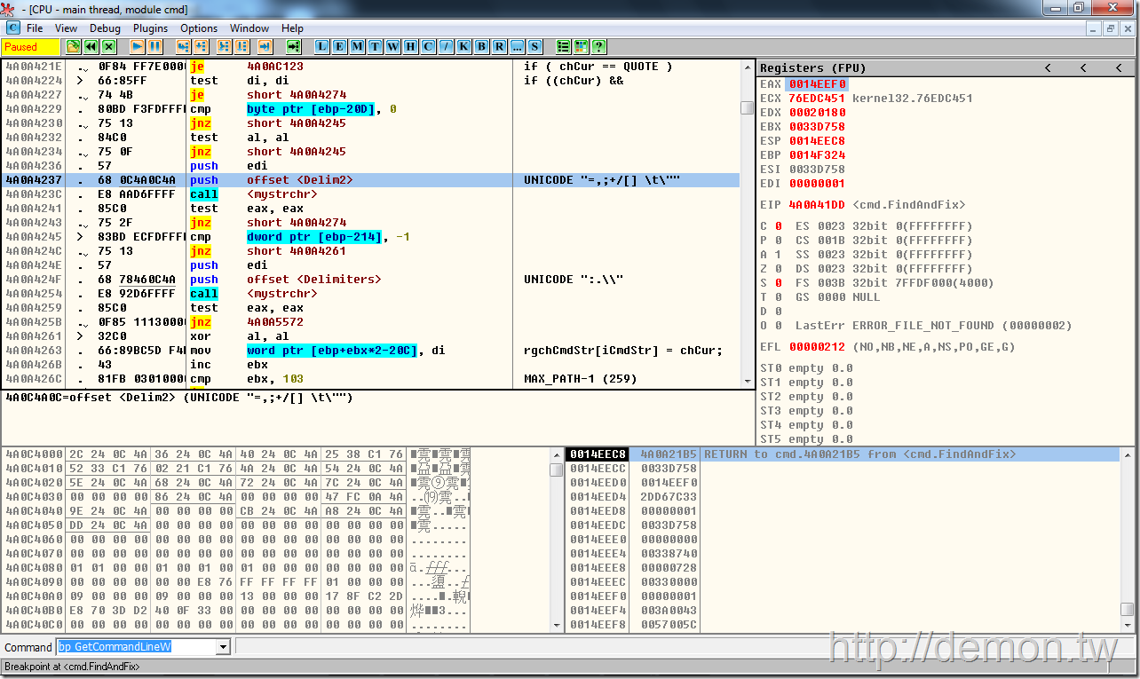 可以看到,CMD對(duì):.\的處理跟+[]/不太一樣,如果是+[]/,CMD會(huì)直接把它們從命令中刪除并且添加到原有參數(shù)的前面;而如果是:.\并且CMD拓展是開啟的話,那么會(huì)多調(diào)用一次GetFileAttributes函數(shù)獲取文件屬性,多調(diào)用一次函數(shù)自然會(huì)多花一些時(shí)間,所以第三組的效率又稍稍比第二組的低些。