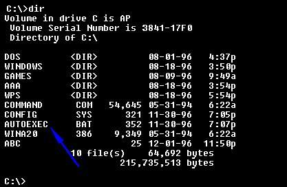 DOS系統(tǒng)啟動時,要先從啟動盤中讀取兩個系統(tǒng)文件IO.SYS、MSDOS.SYS,然后在啟動盤的根目錄下尋找并執(zhí)行 CONFIG.SYS、COMMAND.COM、AUTOEXEC.BAT三個文件。其中IO.SYS、MSDOS.SYS和 COMMAND.COM這三個文件缺一不可,否則電腦將無法正常啟動