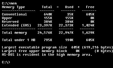 又比如,第二行的這個文件mem.exe,其后綴是exe,也是一個可以執(zhí)行的文件,它的功能是查看電腦目前內(nèi)存的占用情況。在提示符下敲mem,然后回車。(這個命令沒問題,你可以試試看)