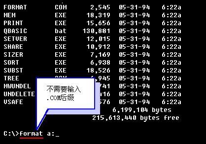 比如第一行的這個文件叫format.com,其后綴名為com,如果我們要執(zhí)行它,只需在提示符下敲入文件基本名然后回車即可,不需輸入后綴名。(這其實(shí)是我們后面要學(xué)的格式化命令format,不要試著按畫面上的提示文字輸入,否則你A盤上的資料就要沒了,等學(xué)了后續(xù)章節(jié)后,你明白了這個命令后再試,現(xiàn)在千萬不要亂用?。。。?/p>