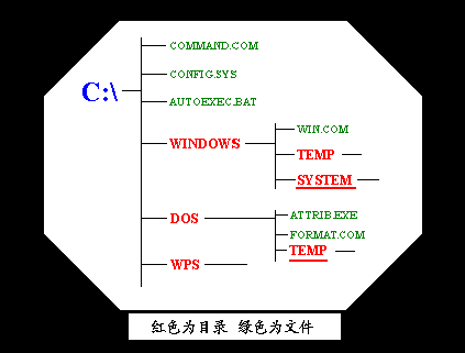那么目錄是什么結(jié)構(gòu)的呢?目錄是樹形結(jié)構(gòu)的,你看,下面是一個目錄結(jié)構(gòu)的示意圖,這個C:表示最上面的一層目錄,叫做根目錄,其它的目錄都是根目錄的子目錄,如DOS,WINDOWS,TOOLS等,而DOS,WINDOWS目錄自己也有子目錄,象DOS下的TEMP目錄,WINDOWS下的SYSTEM目錄。