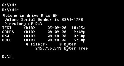 如果我們要更換當(dāng)前目錄到硬盤的其它分區(qū)該怎么辦呢?當(dāng)然不是使用CD,否則我就不用說了,這時應(yīng)該輸入盤符然后回車。比如要到D盤,那么就輸入D:,然后回車,瞧,現(xiàn)在提示符就變成D:\&;了。 再用dir命令,就是列出D盤的文件了。