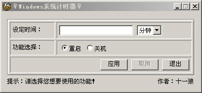Description: 一個用于定時重啟或關閉計算機的小工具,適用于Windows 2K/XP/2003
