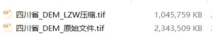 我在進(jìn)行DEM數(shù)據(jù)的裁剪時(shí),發(fā)現(xiàn)各個(gè)省的數(shù)據(jù)量非常大,比如說(shuō)四川省的30m的DEM數(shù)據(jù)的大小為2G。考慮到有限的電腦磁盤(pán)空間,我對(duì)Tif文件采用了LZW壓縮。