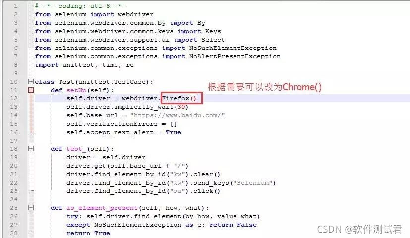 6,打開(kāi)生成的代碼,默認(rèn)是以Firefox瀏覽器作為driver,建議改為Chrome