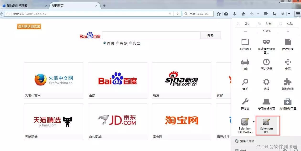 重啟Firefox后可以在工具菜單中看到Selenium IDE的選項(xiàng),表示安裝成功。