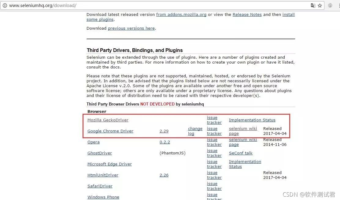 接下來(lái)還要下載一些瀏覽器驅(qū)動(dòng)程序(webdriver),注意Firefox是Selenium原生支持的,但似乎并不是所有Firefox版本都支持,所以我們要找一些驅(qū)動(dòng),另外目前看起來(lái)似乎Firefox在執(zhí)行時(shí)并不穩(wěn)定,而谷歌的Chrome瀏覽器比較好一點(diǎn),所以我們這里選擇Chrome。其驅(qū)動(dòng)都可以在Selenium官網(wǎng)找到,包含IE及其它瀏覽器。