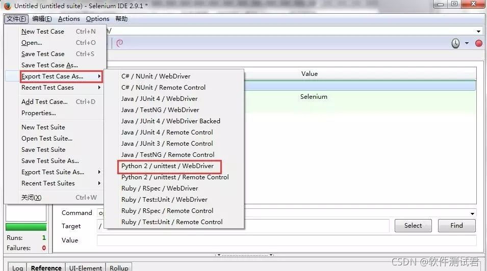 4,假設(shè)這時(shí)我們的錄制已經(jīng)結(jié)束,然后將該腳本導(dǎo)出為python代碼,選擇文件>Export Test Case As>Python,注意這里是python 2, 一般情況下關(guān)系不大,如果你的python環(huán)境是python 3則有些時(shí)候可能要對(duì)代碼做一些修改