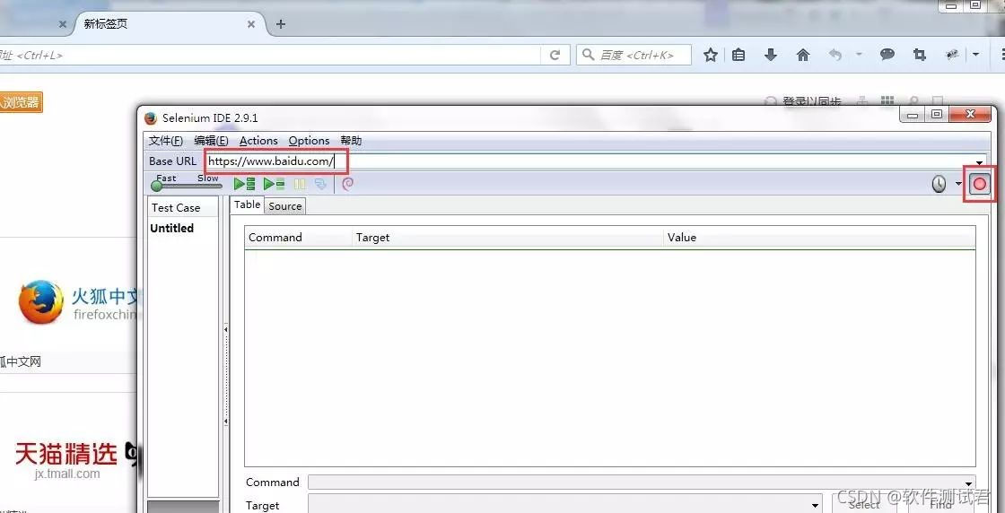 2,彈出Selenium IDE窗口,Base URL輸入http://www.baidu.com,右邊的錄制按鈕保持錄制打開(kāi)(默認(rèn)已經(jīng)打開(kāi))