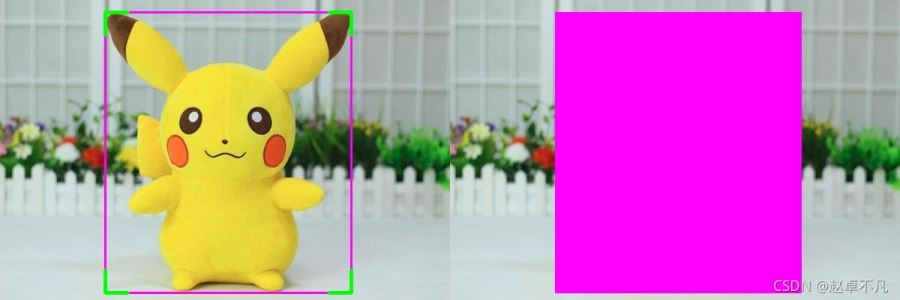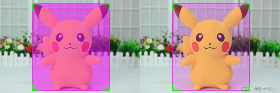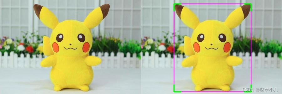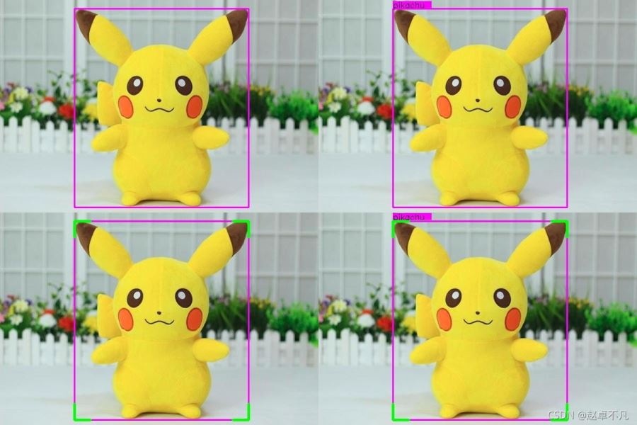 我們以上圖皮卡丘的矩形檢測(cè)框?yàn)槔?左上為我們常用的不帶標(biāo)簽的輸出框,右上為YOLO系列美化帶標(biāo)簽后的矩形框,左下為四個(gè)角點(diǎn)美化后的矩形框,右下為帶標(biāo)簽的角點(diǎn)美化矩形框.