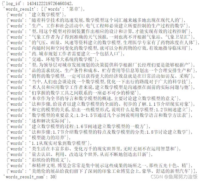 可見,message參數(shù)的結(jié)果為 “大字典” 形式,其中的鍵 words_result 所對應的值為一個 “大列表” ,這個列表里又有很多鍵值對,鍵都是words,值就是AI從圖片上識別出來的內(nèi)容。使用語句message['words_result'][0...n]['words']可以篩選出該頁的標題: