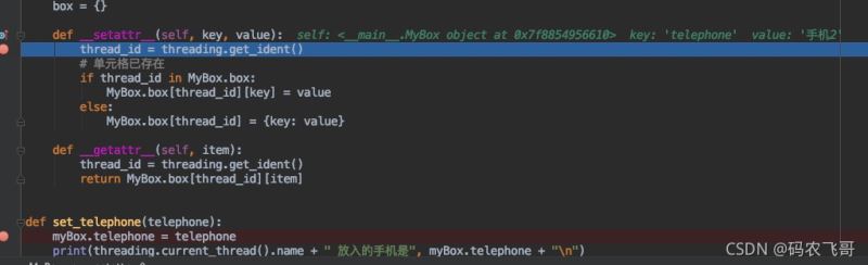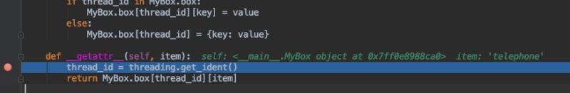 ,實(shí)際上會調(diào)用MyBox的__setattr__方法,參數(shù)key是telephone,參數(shù)value是"手機(jī)xx"。當(dāng)調(diào)用myBox.telephone時實(shí)際上會調(diào)用__getattr__方法,傳入的參數(shù)item是telephone。取值時首先獲取當(dāng)前線程ID。