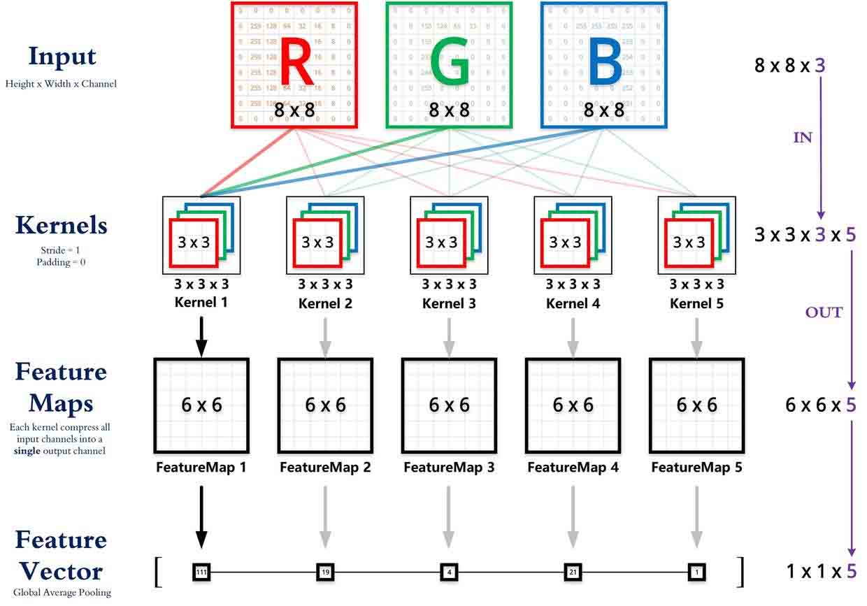 - 輸出矩陣的通道數(shù)(out depth)由卷積核的輸出通道所決定。(綠色標(biāo)注)