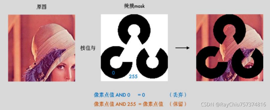 如果將兩幅圖片直接相加會(huì)改變圖片的顏色,如果用圖像混合,則會(huì)改變圖片的透明度,所以我們需要 用按位操作。 首先來了解一下 掩膜(mask) 的概念:掩膜是用一副二值化圖片對另外一幅圖片進(jìn)行局 部的遮擋,看下圖就一目了然了: