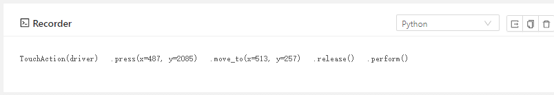 如上圖所示,我們先點(diǎn)擊藍(lán)色選框中像“一橫”的圖標(biāo),然后記得點(diǎn)錄制“眼睛”按鈕。接著,在App上拉兩個(gè)點(diǎn),這2個(gè)點(diǎn)就是滑動(dòng)的間距,最后生成如下圖所示的代碼。