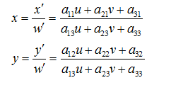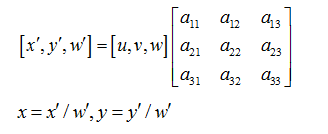 上述公式中,u,v代表原始圖像坐標(biāo),x,y為經(jīng)過(guò)透視變換的圖片坐標(biāo),其中變換矩陣為3X3形式。進(jìn)而可以得到:
