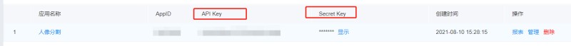 這里面我們可以創(chuàng)建一個人像分割的應用,其中的API Key及Secret Key后面我們調(diào)用人臉識別檢測接口時會用到。