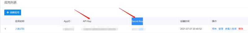這里面我們可以創(chuàng)建一個(gè)人臉識(shí)別應(yīng)用,其中的API Key及Secret Key后面我們調(diào)用人臉識(shí)別檢測(cè)接口時(shí)會(huì)用到。