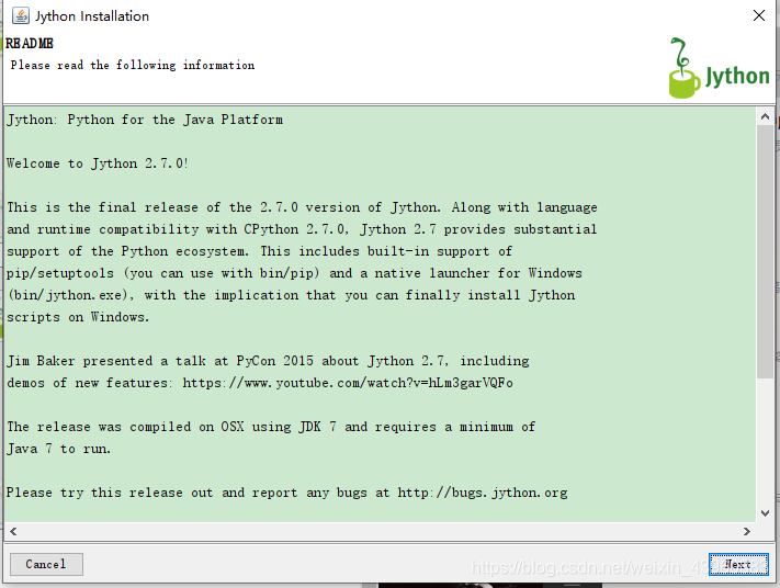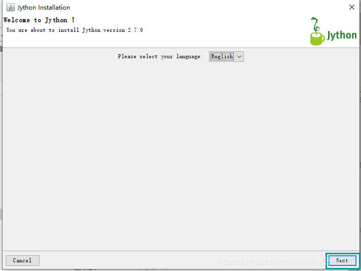首先確定已安裝好了 Java雙擊下載完成的 Jython 安裝包(我下載的是Jython 2.7.0)