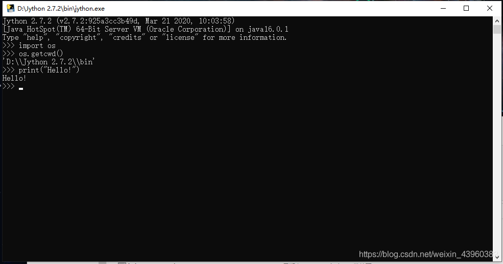 輸入 Python 語(yǔ)句,看是否安裝成功(Jython 程序也可以運(yùn)行 Python代碼)