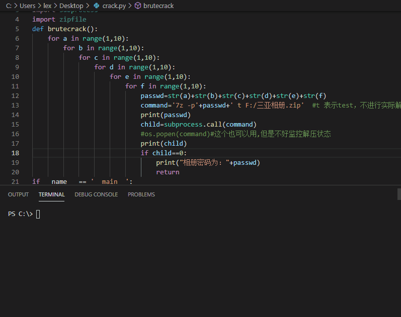 首先如果想要python命令行來(lái)打開(kāi)小姐姐相冊(cè),那么首先要找到嘗試打開(kāi)的命令行,即解壓縮時(shí)使用的命令行。然后我們使用python腳本寫(xiě)嵌套循環(huán),不斷的對(duì)zip文件進(jìn)行嘗試解壓,然后找回真實(shí)的密碼。
