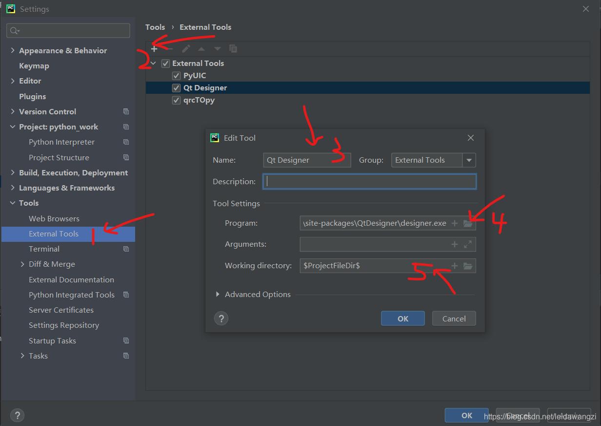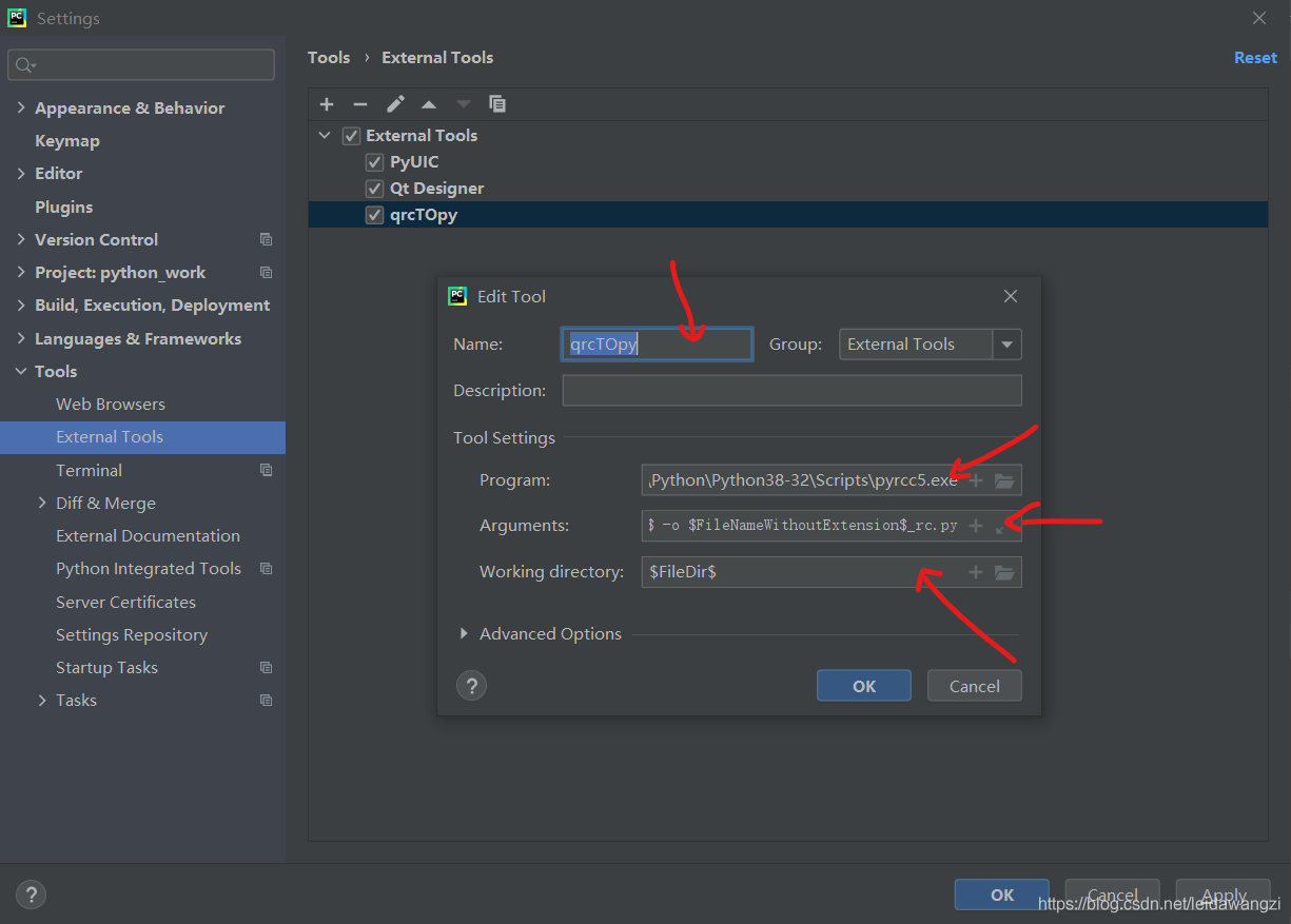 Arguements:$FileName$ -o $FileNameWithoutExtension$_rc.py將.qrc文件轉(zhuǎn)換成.py文件的語(yǔ)句。