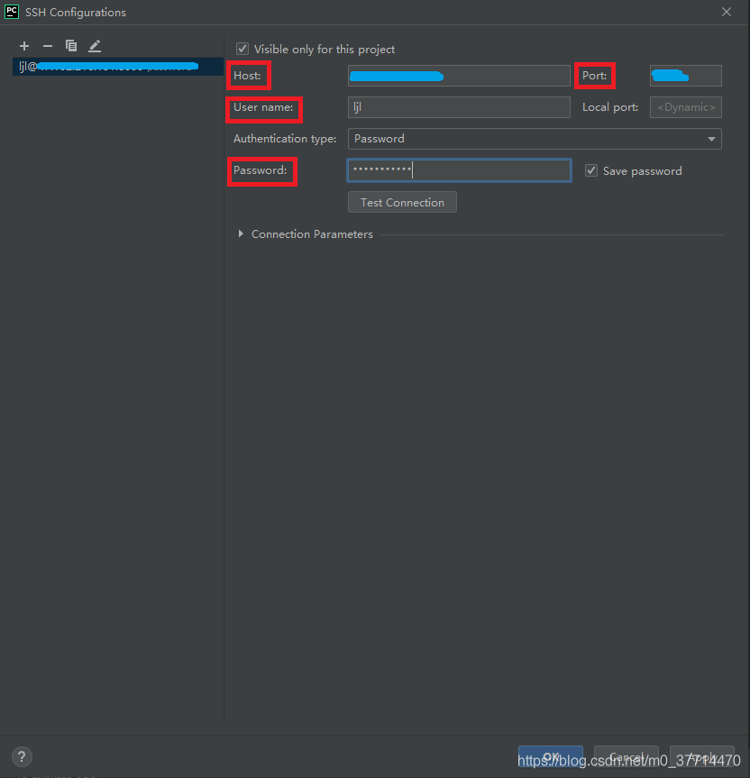 b. 在 “Connection” 選項卡下的 SSH configuration 選項填寫服務(wù)器鏈接的相關(guān)信息