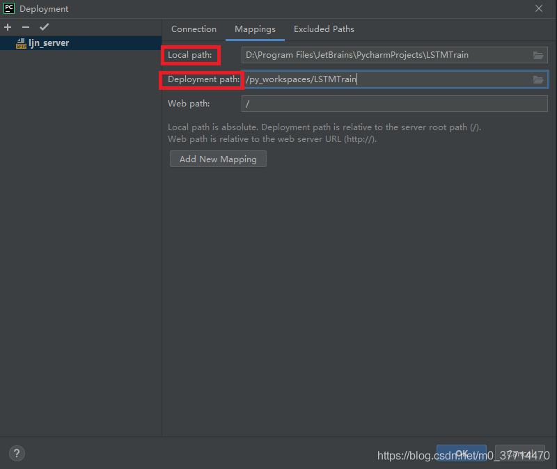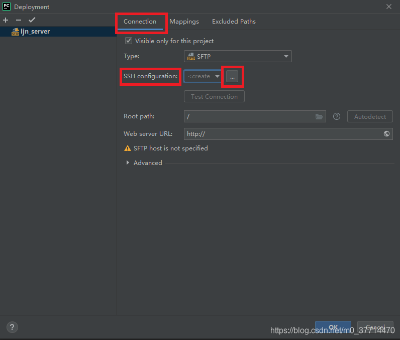 在 "Deployment" 窗口可以觀察到 “SSH configurations” 已經(jīng)填好,以后再配置其他項目時,可以直接選擇該 SSH configurations 即可;填寫 Root Path,這里就是想要在本地加載的服務(wù)器目錄的起始地址;Web server URL 暫時用不到,此處先不進(jìn)行配置