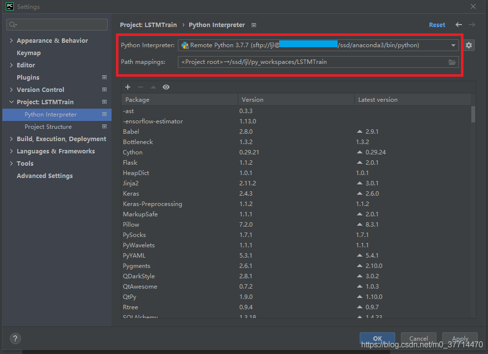 (5)當(dāng)返回到 “Python Interpreter” 窗口時,發(fā)現(xiàn) Python Interpreter 已經(jīng)變成服務(wù)器端開發(fā)環(huán)境,Path Mappings 也是我們想要的本地項目到服務(wù)器項目的映射。