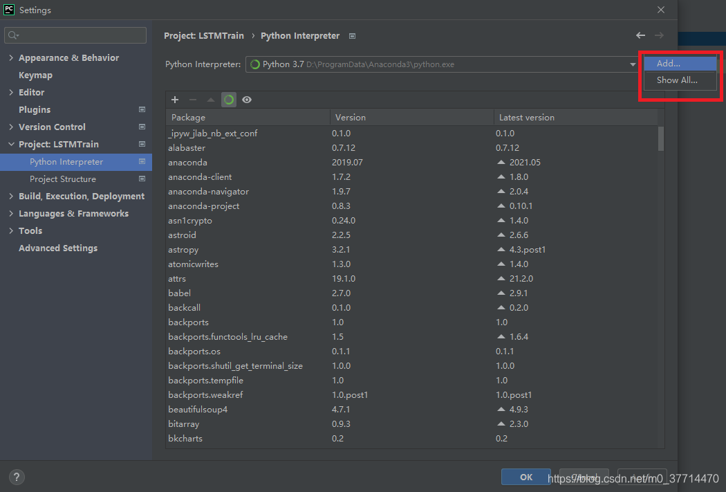 (1)打開 File - Settings,選擇 Project: 你的項目名 - Python Interpreter