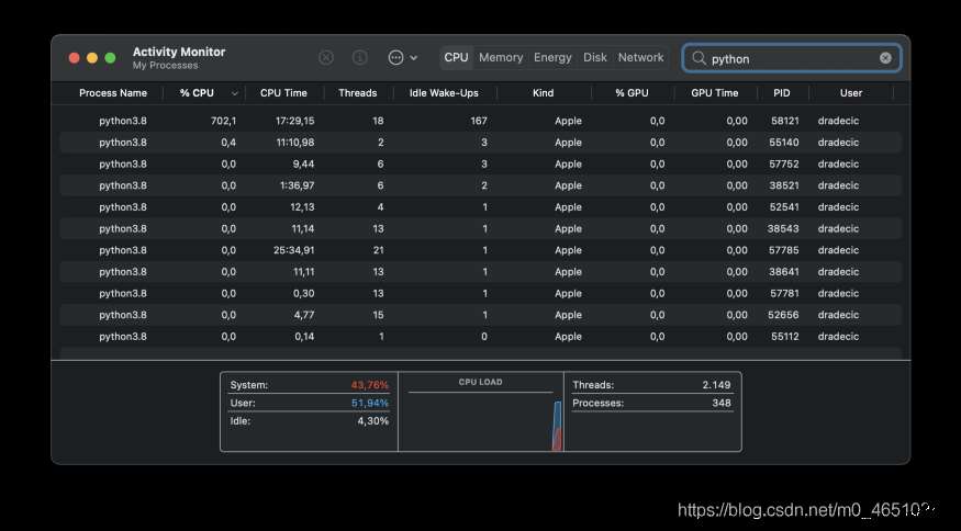 看樣子還不錯(cuò)!讓我們打開Activity Monitor來驗(yàn)證Python是否在本機(jī)運(yùn)行: