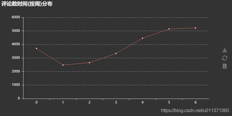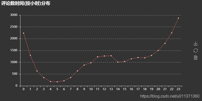 評論時間按周分布圖可以看出,評論數在一周當中前面較少,后面逐漸增多,這可以解釋為往后接近周末,大家有更多時間來聽聽歌、刷刷歌評,而一旦周末過完,評論量馬上下降(周日到周一的下降過渡),大家又回歸到工作當中。