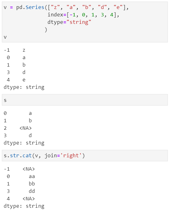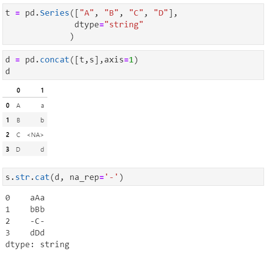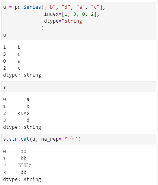 連接一個(gè)序列和另一個(gè)等長(zhǎng)的列表,默認(rèn)情況下如果有缺失值,則會(huì)導(dǎo)致結(jié)果中也有缺失值,不過可以通過指定缺失值na_rep的情況進(jìn)行處理