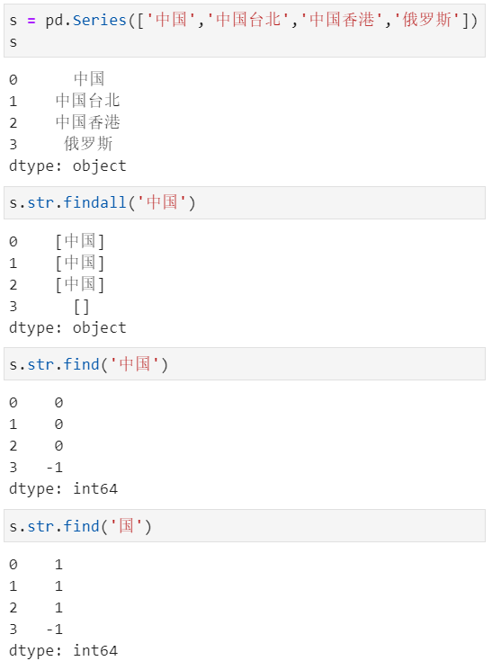 文本查詢,str.findall()返回查詢到的值,str.find()返回匹配到的結(jié)果所在的位置(-1表示不存在)