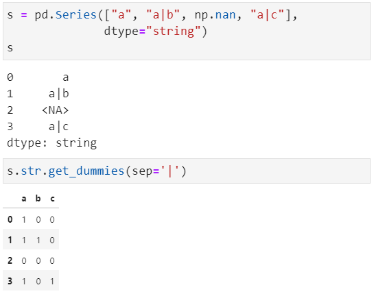 我們還可以從字符串列中提取虛擬變量,例如用"|"分隔(第一行abc只有a,第二行有a和b,第三行都沒有,第四行有a和c):