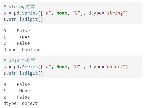 對(duì)于sting來說,返回數(shù)字輸出的字符串訪問器方法將始終返回可為空的整數(shù)類型;對(duì)于object來說,是 int 或 float,具體取決于 NA 值的存在