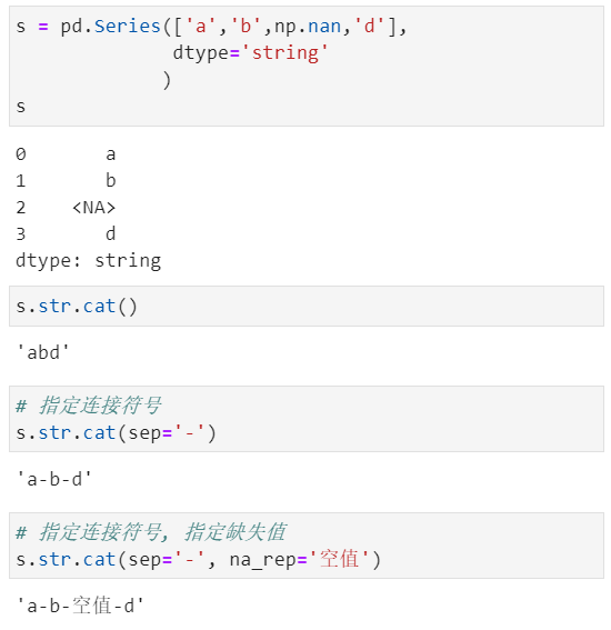 比如,將一個(gè)序列的內(nèi)容進(jìn)行拼接,默認(rèn)情況下會(huì)忽略缺失值,我們亦可指定缺失值