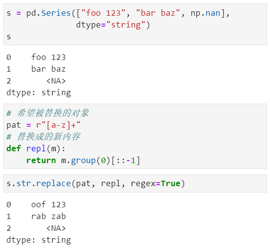 此外,我們還可以正則表達(dá)式替換,比如下面這個(gè)例子中我們實(shí)現(xiàn)的是對(duì)文本數(shù)據(jù)中英文部分進(jìn)行倒序替換: