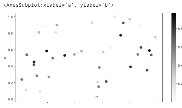 df.plot.scatter(x="a", y="b", c="c", s=50) # 參數(shù)s代表散點(diǎn)大小