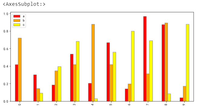 df.plot.bar(color=['red','orange','yellow'], edgecolor='grey')
