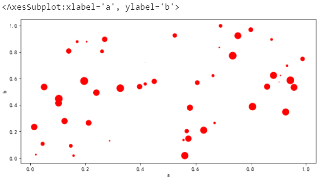 df.plot.scatter(x="a", y="b", color="red", s=df["c"] * 200)