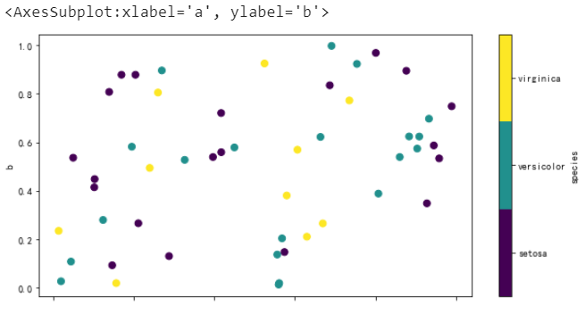 df.plot.scatter(x="a", y="b", c="species", cmap="viridis", s=50)