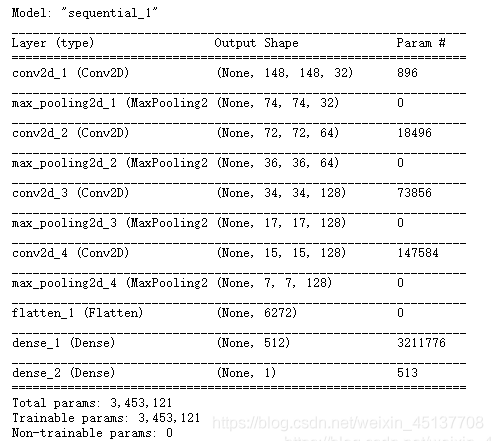 注意:feature map的深度在網(wǎng)絡(luò)中逐漸增加(從32到128),而feature map的大小在減少(從148x148到7x7)。這是你會(huì)在幾乎所有convnets中看到的模式。由于我們解決的是一個(gè)二元分類問(wèn)題,我們用一個(gè)單一單元(一個(gè)大小為1的稠密層)和一個(gè)s型激活來(lái)結(jié)束網(wǎng)絡(luò)。這個(gè)單元將對(duì)網(wǎng)絡(luò)正在查看一個(gè)類或另一個(gè)類的概率進(jìn)行編碼。