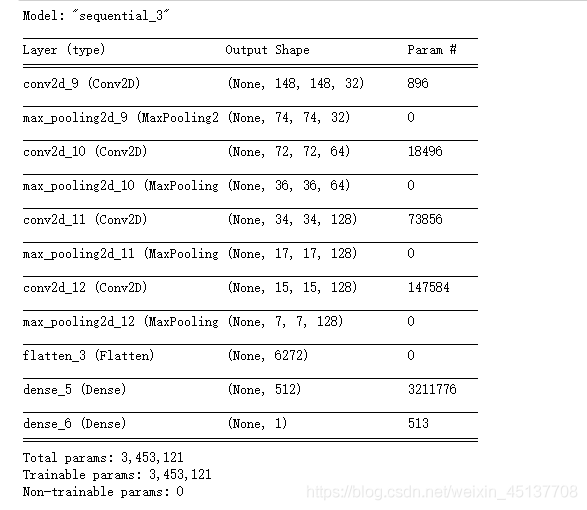 讓我們來(lái)看看特征地圖的尺寸是如何隨著每一個(gè)連續(xù)的層:為我們編譯步驟,我們將一如既往地使用RMSprop優(yōu)化器。由于我們用一個(gè)單一的乙狀結(jié)腸單元結(jié)束我們的網(wǎng)絡(luò),我們將使用二進(jìn)制交叉熵作為我們的損失
