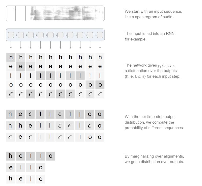 對(duì)于輸入序列 X = [ x 1 , x 2 , . . , x T ] X=[x_1, x_2, .., x_T] X=[x1,x2,..,xT] 和 輸出序列 Y = [ y 1 , y 2 , . . . , y U ] Y = [y_1, y_2, ..., y_U ] Y=[y1,y2,...,yU],我們希望訓(xùn)練一個(gè)模型使條件概率 P ( Y ∣ X ) P(Y|X) P(Y∣X) 達(dá)到最大化,并且給定新的輸入序列時(shí)我們希望模型可以推測(cè)出最優(yōu)的輸出序列, Y ∗ = a r g m a x Y P ( Y ∣ X ) Y^*=\underset{Y}{argmax}\space P(Y|X) Y∗=Yargmax P(Y∣X),而CTC算法剛好可以同時(shí)做到訓(xùn)練和解碼。