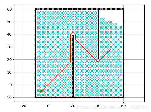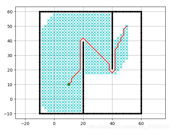 rx, ry = dijkstra.planning(sx, sy, gx, gy)