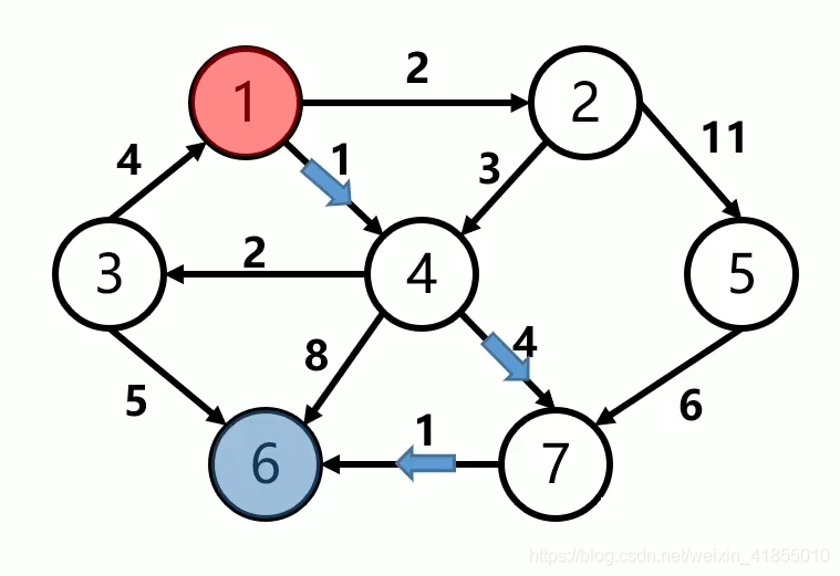 如圖所示,Dijkstra算法要解決的是一個有向權重圖中最短路徑的尋找問題,圖中紅色節(jié)點1代表起始節(jié)點,藍色節(jié)點6代表目標結點。箭頭上的數(shù)字代表兩個結點中的的距離,也就是模型中所謂的代價(cost)。