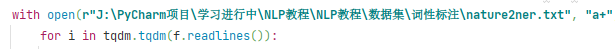 with open(r"J:\PyCharm項目\學(xué)習(xí)進(jìn)行中\(zhòng)NLP教程\NLP教程\數(shù)據(jù)集\詞性標(biāo)注\nature2ner.txt","a+",encoding="utf-8")as f_: