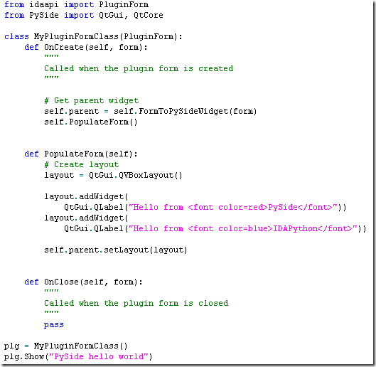 為了從 IDAPython 編寫 UI,您必須繼承 idaapi.PluginForm類。這個類本質上包裝了 create_tform()/display_tform() 并提供了一些輔助函數(shù)(例如將 QWidget* 傳遞給 Python,PySide 可以將其用作父小部件)。