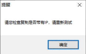 win32api.MessageBox(0, "請(qǐng)您檢查復(fù)制是否帶有IP,請(qǐng)重新測(cè)試", "提醒", win32con.MB_OK)